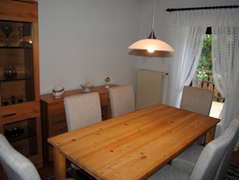 Das Esszimmer verbindet im Erdgeschoss die Küche mit dem Wohnzimmer. Sat-TV steht im Wohnzimmer zu Ihrer Verfügung. Vom Esszimmer aus gelangen Sie auf die Terrasse und in den Garten.
